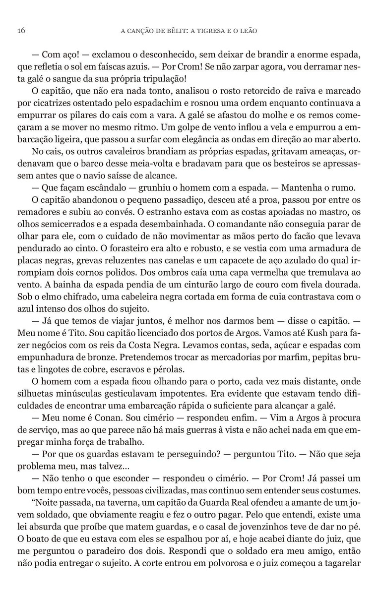 Quanto a embarcação mercante a bordo da qual Conan está viajando é abordada por um navio pirata, o cimério sabe que precisará como nunca se quiser escapar com vida. O que não imagina é que a capitã inimiga, Bêlit, irá se apaixonar por ele. A bordo do Tigresa, o cimério aprende sobre o ofício da navegação, cria laços com homens de várias nações do mundo e descobre mais sobre a corajosa capitã shemita — cuja paixão avassaladora é cada vez mais correspondida pelo bárbaro. Depois de uma temporada de assaltos e negociações, Conan recebe a honra de conhecer o arquipélago oculto Nakanda Wazuri. Lá, o homem se vê envolvido com tramas políticas, profecias antigas e poderosas organizações mágicas. É uma trama de vingança, luta e aventura — mas também de amor, confiança, luto e saudades. A canção de Bêlit, história dividida em dois volumes, começa logo depois do início de “A rainha da Costa Negra” — conto escrito por Robert E. Howard — e conta três anos da vida conjunta de Conan e Bêlit, quando se enlaça de novo ao final da história original escrita pelo criador do cimério.