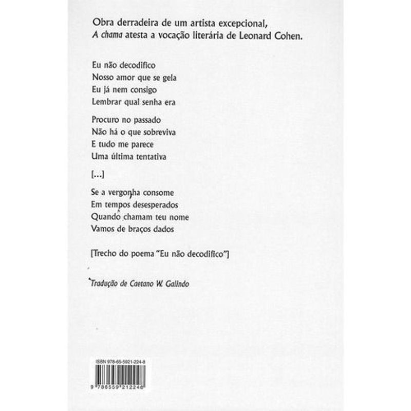 Último livro de Leonard Cohen, A chama confirma sua extraordinária vocação literária. Para Adam Cohen, filho do poeta e compositor, “escrever era o seu único consolo, o seu propósito mais verdadeiro”. Edição bilíngue. Seguindo as instruções deixadas por Leonard Cohen, falecido em 2016, este volume é dividido em três partes. A primeira reúne 63 poemas escritos ao longo de décadas, extraídos de um precioso baú de inéditos. A segunda abarca os poemas que viriam a se tornar letras de música, gravadas nos seus últimos quatro discos. Já a seção final recupera fragmentos dos cadernos do poeta e compositor — um material burilado a partir de três mil páginas, trabalhadas por cerca de sessenta anos. A chama inclui ainda dezenas de autorretratos e outros desenhos, além do discurso que o compositor proferiu ao receber o prêmio Príncipe das Astúrias, na Espanha, em 2011. “Fui tão longe atrás da beleza, deixei tanto para trás”, escreve Leonard Cohen em uma de suas músicas. Aqui estão os bastidores de um artista singular, cuja obra — capaz de descrever o arrebatamento, o desejo, a melancolia, a morte e a solidão — conquistou gerações de admiradores.