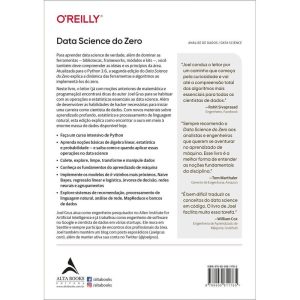 Para aprender data science de verdade, além de dominar as ferramentas — bibliotecas, frameworks, módulos e kits —, você também deve compreender as ideias e os princípios da área. Atualizada para o Python 3.6, a segunda edição do Data Science do Zero explica a dinâmica das ferramentas e algoritmos ao implementá-los do zero. Neste livro, o leitor (já com noções anteriores de matemática e programação) encontrará dicas do autor Joel Grus para se habituar com as operações e estatísticas essenciais ao data science. Além de desenvolver as habilidades de hacker necessárias para iniciar uma carreira como cientista de dados. Com novos materiais sobre aprendizado profundo, estatística e processamento de linguagem natural, esta edição explica como encontrar o ouro em meio à enorme massa de dados disponível hoje. • Faça um curso intensivo de Python • Aprenda noções básicas de álgebra linear, estatística e probabilidade — e saiba como e quando aplicar essas operações no data science • Colete, explore, limpe, transforme e manipule dados • Conheça os fundamentos do aprendizado de máquina • Implemente os modelos de k-vizinhos mais próximos, Naive Bayes, regressão linear e logística, árvores de decisão, s neurais e agrupamentos • Explore sistemas de recomendação, processamento de linguagem natural, análise de , MapReduce e bancos de dados