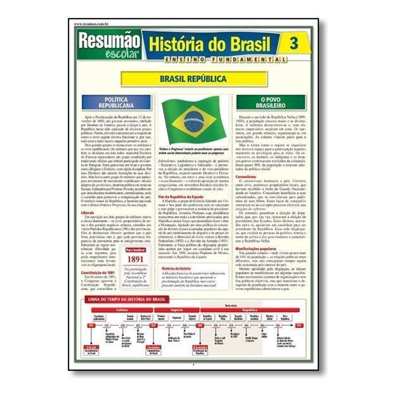 Os principais acontecimentos da história republicana brasileira foram divididos em dois Resumões. História do Brasil 3 aborda o primeiro período, desde a proclamação da República até o golpe militar de 1964. A política republicana, a Constituição de 1891 e o fim da República da Espada, o coronelismo, as manifestações populares, a remodelação do Rio e a revolta da Chibata, a economia complexa, o drama de Canudos, a imigração em massa, o movimento operário, o tenentismo em ação, a revolução de 1930, o Estado novo, os problemas da economia, o movimento socialista, a democracia populista e o Período JK. E mais: os anos de crise, o parlamentarismo e o golpe de Estado.