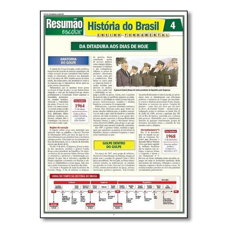 Os principais acontecimentos da história republicana brasileira foram divididos em dois Resumões. História do Brasil 4 aborda o segundo período, desde a ditadura militar até os dias de hoje. A anatomia do golpe e o regime de exceção, o golpe dentro do golpe, o Ato Institucional no. 5, o populismo autoritário, a luta armada e a repressão, o milagre brasileiro, a cultura contra a ditadura, a abertura lenta e gradual, a transição à democracia, a economia, da crise aos planos, a Constituição Cidadã, os caras pintas, o plano Real, Lula chega ao poder, o Brasil no mundo e a sexta economia.