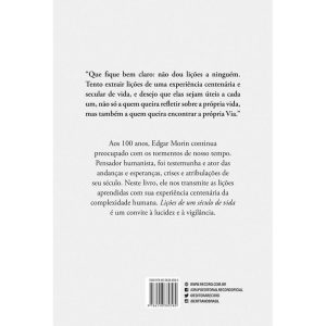 Em celebração a seu 100º aniversário, Edgar Morin presenteia os leitores com um texto inspirador e revigorante, mas também lúcido e revelador. Sociólogo, antropólogo, historiador e filósofo, Edgar Morin é um dos maiores pensadores contemporâneos e um dos últimos grandes intelectuais da época de ouro do pensamento francês do século XX. Autor de mais de 80 livros sobre temas que vão do cinema à educação, da política à psicologia, neste Lições de um século de vida ele se debruça sobre a própria história.Conhecemos o homem, o resistente, o companheiro, o pensador, o pai. Aprendemos mais sobre sua filosofia, as obras que escreveu e aquelas que influenciaram sua personalidade, seu ponto de vista sobre o mundo, sobre a humanidade, sobre a política. No entanto, Lições de um século de vida tem um alcance muito mais amplo do que a vida e o pensamento de Edgar Morin, pois representa um testemunho sobre o século XX: seus horrores, suas utopias que deram errado, suas revoluções que trouxeram esperança.Morin aponta alguns impasses da humanidade, sugere saídas e reconhece alguns erros, coletivos e individuais. O autor volta-se para o passado a fim de nos contar sobre o presente e até sobre o futuro: ele evoca novos desafios – e riscos – que devemos enfrentar e, acima de tudo, como podemos tirar proveito de nossa formação para abraçar o que está por vir.Por meio de seu comovente relato e de seus aforismos finais que iluminam nosso caminho, Edgar Morin mantém sua promessa: compartilhar as lições que sua vida lhe ensinou sem nos dar uma lição.