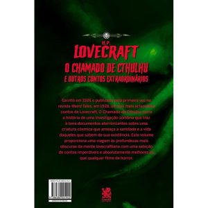 Escrito em 1926 e publicado pela primeira vez na revista Weird Tales, 1928, um dos mais aclamados contos de Lovecraft, O Chamado de Cthulhu narra a história de uma investigação sombria que traz à tona documentos aterrorizantes sobre uma criatura cósmica que ameaça a sanidade e a vida daqueles que sabem de sua existência. Este volume proporciona uma viagem às profundezas mais obscuras da mente lovecraftiana com uma seleção de contos imperdíveis e absolutamente melhores do que qualquer filme de horror.