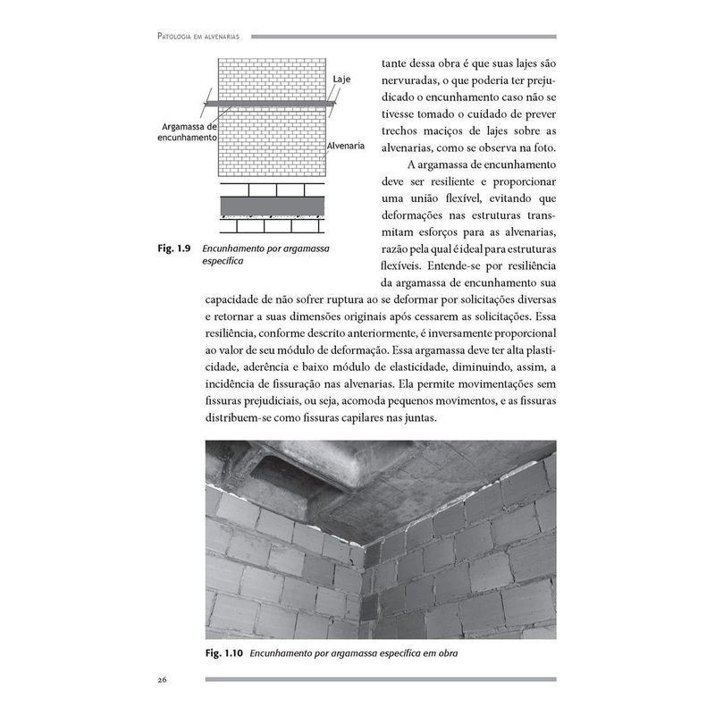 Alvenaria é usada desde a pré-história e continua sendo o sistema construtivo mais difundido, inclusive no Brasil. Uma breve observação nas edificações existentes nos revela alta incidência de anomalias em alvenarias e revestimentos. Esta obra vem trazer esclarecimentos e soluções a esses problemas. Após abordar aspectos de projeto e detalhes construtivos importantes em alvenarias de vedação e alvenarias estruturais, o livro descreve de forma clara e didática as patologias e suas causas mais comuns, bem ilustradas por esquemas e fotos de casos reais, não descuidando ainda dos revestimentos argamassados. A terceira parte do livro se debruça sobre a identificação dos maus desempenhos, suas causas e reparos possíveis. Uma grande contribuição para a melhoria das práticas construtivas e manutenção das edificações.