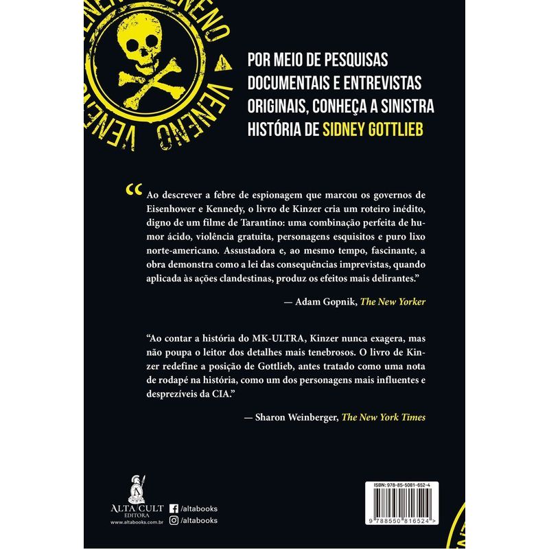 fascinante história do cientista que supervisionou os experimentos secretos da CIA com drogas e controle da mente nos anos 1950 e 1960. No comando do projeto MK-ULTRA, Gottlieb coordenou experimentos brutais em prisões secretas instaladas em três continentes. Ele fabricava pílulas, pós e poções, letais e irrastreáveis — alguns desses itens foram utilizados em atentados contra Fidel Castro e outros líderes estrangeiros. Contratadas por Gottlieb, prostitutas atraíam clientes para bordéis da CIA, onde esses indivíduos eram drogados com substâncias psicotrópicas. Seus experimentos disseminaram o LSD pelos Estados Unidos e fizeram dele um dos padrinhos ocultos da contracultura que sacudiu os anos 1960. Durante anos, Gottlieb foi o principal fornecedor de equipamentos de espionagem utilizados por agentes da CIA no mundo todo. Por meio de pesquisas documentais e entrevistas originais, conheça a sinistra história de Sidney Gottlieb Ao descrever a febre de espionagem que marcou os governos de Eisenhower e Kennedy, o livro de Kinzer cria um roteiro inédito, digno de um filme de Tarantino: uma combinação perfeita de humor ácido, violência gratuita, personagens esquisitos e puro lixo norte-americano. Assustadora e, ao mesmo tempo, fascinante, a obra demonstra como a lei das consequências imprevistas, quando aplicada às ações clandestinas, produz os efeitos mais delirantes.” — Adam Gopnik, The New Yorker “Ao contar a história do MK-ULTRA, Kinzer nunca exagera, mas não poupa o leitor dos detalhes mais tenebrosos. O livro de Kinzer fine a posição de Gottlieb, antes tratado como uma nota de rodapé na história, como um dos personagens mais influentes e desprezíveis da CIA.” — Sharon Weinberger, The New York Times