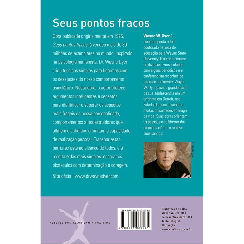 Obra publicada originalmente em 1976, Seus pontos fracos já vendeu mais de 30 milhões de exemplares no mundo. Inspirado na psicologia humanista, Dr. Wayne Dyer criou técnicas simples para lidarmos com os desajustes do nosso comportamento psicológico. Nesta obra, o autor oferece argumentos inteligentes e sensatos para identificar e superar os aspectos mais frágeis da nossa personalidade, comportamentos autodestruidores que afligem o cotidiano e limitam a capacidade de realização pessoal. Transpor estas barreiras está ao alcance de todos, e a receita é das mais simples: encarar os obstáculos com determinação e coragem.