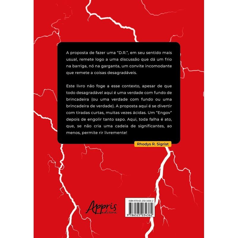 A proposta de fazer uma “D.R.”, em seu sentido mais usual, remete logo a uma discussão que dá um frio na barriga, nó na garganta, um convite incomodante que remete a coisas desagradáveis. Este livro não foge a esse contexto, apesar de que todo desagradável aqui é uma verdade com fundo de brincadeira (ou uma verdade com fundo ou uma brincadeira de verdade). A proposta aqui é se divertir com tiradas curtas, muitas vezes ácidas. Um “Engov” depois de engolir tanto sapo. Aqui, toda falha é ato, que, se não cria uma cadeia de significantes, ao menos, permite rir livremente!